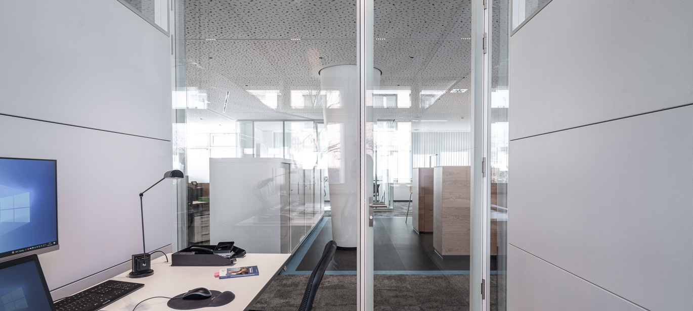 Die Trennwand besticht durch vielseitige Ausführungsmöglichkeiten, begonnen bei sichtbaren oder überglasten Verglasungsrahmen mit ein- bis dreischaligen Verglasungsvarianten, Vollwandelementen mit allen gängigen Schichtstoffoberflächen oder in pulverbeschichteter Blechoberfläche für mehr Strapazierfähigkeit bis hin zu Regal- und Organisationselementen, die ohne Umbauarbeiten auch nachträglich zwischen den Trennwandelementen in die Konstruktion eingehängt werden. Hier gibt es alles, natürlich auch die dazu passenden Türelemente.