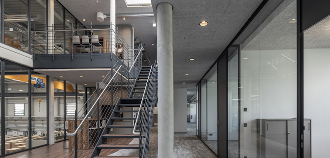 Die Zwischendecken wurden aus Beton und Stahlstützen realisiert, während die Systemtrennwandelemente für eine abgestimmte Akustik und Raumaufteilung sorgen. Die enge Zusammenarbeit mit dem Architekten ermöglichte ein Raumkonzept, das klassischen Bürotrakt-Standards entspricht – trotz der Lage innerhalb einer Produktionshalle. So entstand eine effiziente Verbindung von Produktion und Verwaltung, die den Anforderungen der modernen Arbeitswelt gerecht wird.