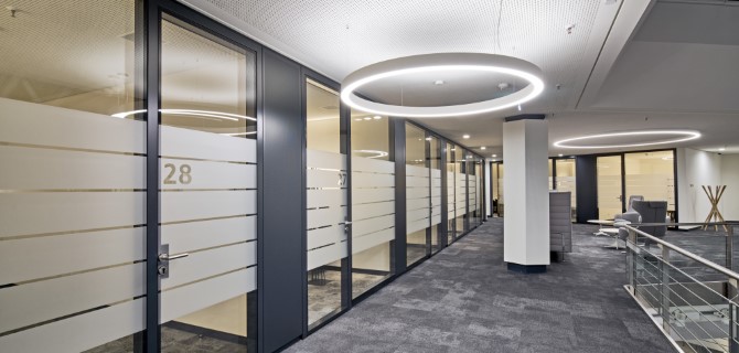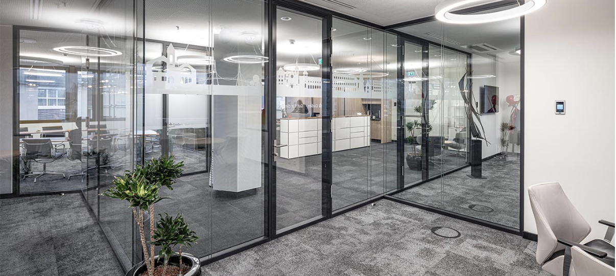 Lehnert Raumteiler-Glaswand-Systeme werden in zahlreichen Unternehmen eingesetzt. Sie gliedern Open-Space-Flächen, schaffen Rückzugsorte in Einzelbüros und verbinden Bereiche in Foyers oder Fluren.